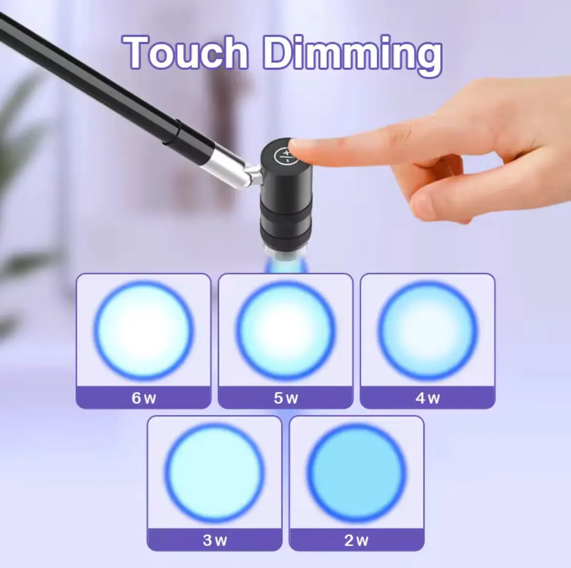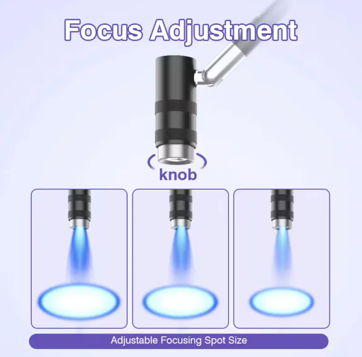 Lampan har LED lampa med 5 watt och UV-ljuset har en våglängd inom 395-405nm, den ligger inom UV-A, vilket räknas till de ofarliga. Lampan levereras med en fotpedal som används för att starta lampan. Placera lampan på golvet bredvid din behandlingsbänk och justera sedan armen så att du får lampan i önskad position och vinkel. Var noga med att följa råden om hur du arbetar säkert med UV/LED!